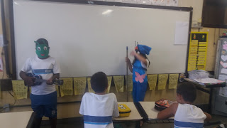 Alunos do 1º ano ouviram a história "A Cigarra e a Formiga" e auxiliados pela professora de Sala de Leitura Marcia Brum, dramatizam a história.